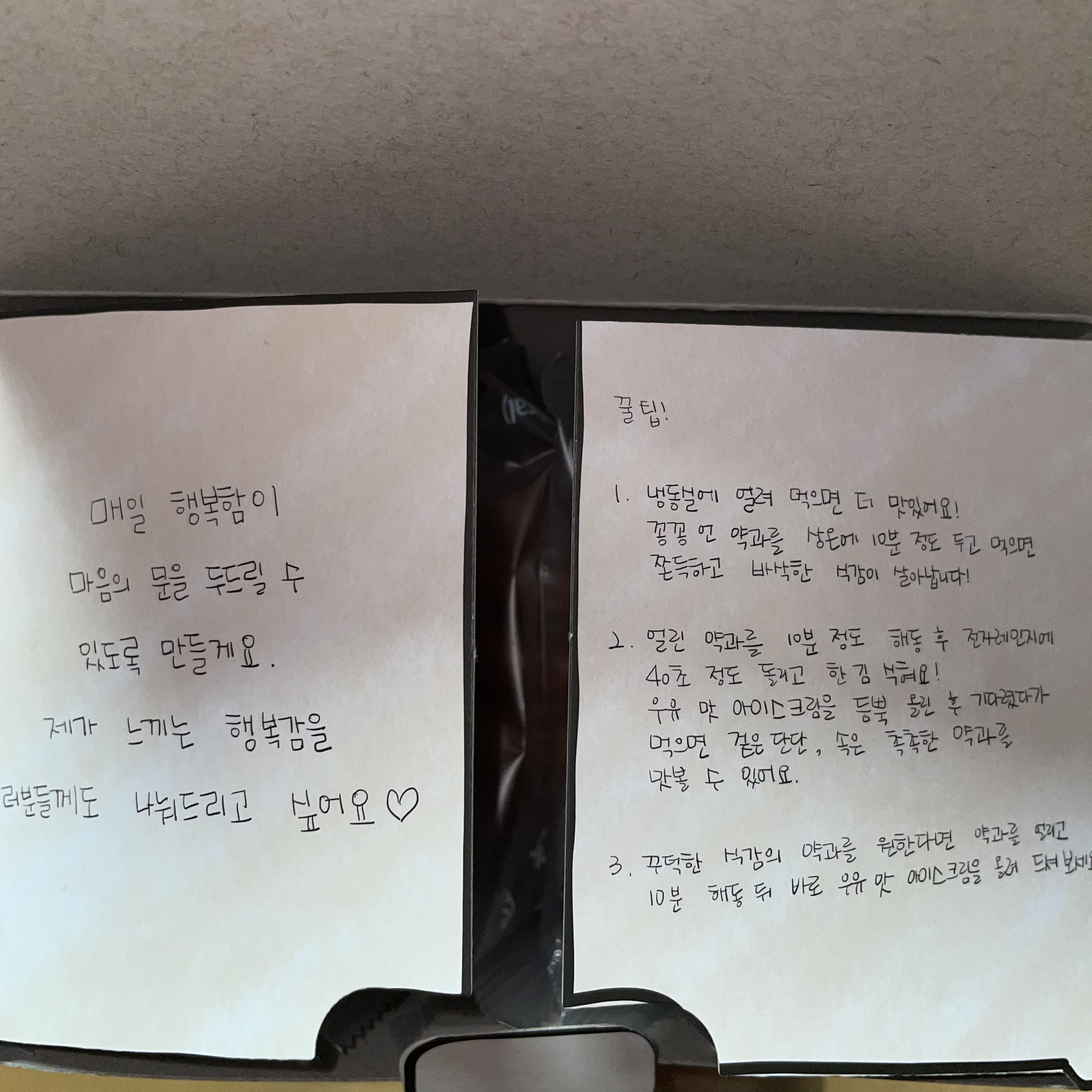 박스를 열면 나오는 여수언니의 손글씨로 적히 약과 맛나게 먹는 꿀팁!!